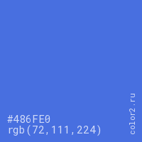 Цвет #486FE0 в цветовой модели RGB обозначается тремя октетами (72, 111, 224) в десятичном формате и #486FE0 в шестнадцатиричном (hex) формате, которые являются интенсивностью красного 72 (hex 48), интенсивность зелёного 111 (hex 6F) и интенсивность синего 224 (hex E0).