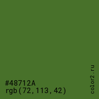 Цвет #48712A в цветовой модели RGB обозначается тремя октетами (72, 113, 42) в десятичном формате и #48712A в шестнадцатиричном (hex) формате, которые являются интенсивностью красного 72 (hex 48), интенсивность зелёного 113 (hex 71) и интенсивность синего 42 (hex 2A).