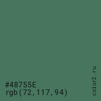 Цвет #48755E в цветовой модели RGB обозначается тремя октетами (72, 117, 94) в десятичном формате и #48755E в шестнадцатиричном (hex) формате, которые являются интенсивностью красного 72 (hex 48), интенсивность зелёного 117 (hex 75) и интенсивность синего 94 (hex 5E).