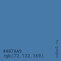 Цвет #487AA9 в цветовой модели RGB обозначается тремя октетами (72, 122, 169) в десятичном формате и #487AA9 в шестнадцатиричном (hex) формате, которые являются интенсивностью красного 72 (hex 48), интенсивность зелёного 122 (hex 7A) и интенсивность синего 169 (hex A9).