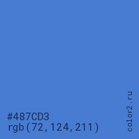 Цвет #487CD3 в цветовой модели RGB обозначается тремя октетами (72, 124, 211) в десятичном формате и #487CD3 в шестнадцатиричном (hex) формате, которые являются интенсивностью красного 72 (hex 48), интенсивность зелёного 124 (hex 7C) и интенсивность синего 211 (hex D3).