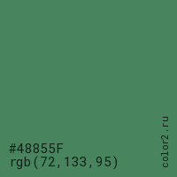 Цвет #48855F в цветовой модели RGB обозначается тремя октетами (72, 133, 95) в десятичном формате и #48855F в шестнадцатиричном (hex) формате, которые являются интенсивностью красного 72 (hex 48), интенсивность зелёного 133 (hex 85) и интенсивность синего 95 (hex 5F).
