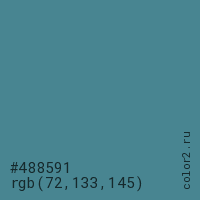 Цвет #488591 в цветовой модели RGB обозначается тремя октетами (72, 133, 145) в десятичном формате и #488591 в шестнадцатиричном (hex) формате, которые являются интенсивностью красного 72 (hex 48), интенсивность зелёного 133 (hex 85) и интенсивность синего 145 (hex 91).