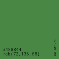 Цвет #488844 в цветовой модели RGB обозначается тремя октетами (72, 136, 68) в десятичном формате и #488844 в шестнадцатиричном (hex) формате, которые являются интенсивностью красного 72 (hex 48), интенсивность зелёного 136 (hex 88) и интенсивность синего 68 (hex 44).