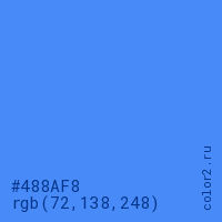 Цвет #488AF8 в цветовой модели RGB обозначается тремя октетами (72, 138, 248) в десятичном формате и #488AF8 в шестнадцатиричном (hex) формате, которые являются интенсивностью красного 72 (hex 48), интенсивность зелёного 138 (hex 8A) и интенсивность синего 248 (hex F8).