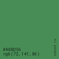 Цвет #488D56 в цветовой модели RGB обозначается тремя октетами (72, 141, 86) в десятичном формате и #488D56 в шестнадцатиричном (hex) формате, которые являются интенсивностью красного 72 (hex 48), интенсивность зелёного 141 (hex 8D) и интенсивность синего 86 (hex 56).