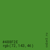 Цвет #488F2E в цветовой модели RGB обозначается тремя октетами (72, 143, 46) в десятичном формате и #488F2E в шестнадцатиричном (hex) формате, которые являются интенсивностью красного 72 (hex 48), интенсивность зелёного 143 (hex 8F) и интенсивность синего 46 (hex 2E).