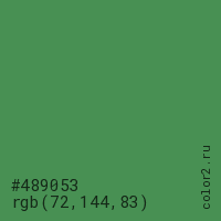 Цвет #489053 в цветовой модели RGB обозначается тремя октетами (72, 144, 83) в десятичном формате и #489053 в шестнадцатиричном (hex) формате, которые являются интенсивностью красного 72 (hex 48), интенсивность зелёного 144 (hex 90) и интенсивность синего 83 (hex 53).