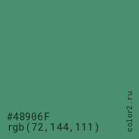Цвет #48906F в цветовой модели RGB обозначается тремя октетами (72, 144, 111) в десятичном формате и #48906F в шестнадцатиричном (hex) формате, которые являются интенсивностью красного 72 (hex 48), интенсивность зелёного 144 (hex 90) и интенсивность синего 111 (hex 6F).