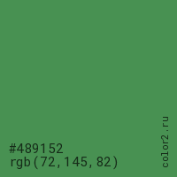 Цвет #489152 в цветовой модели RGB обозначается тремя октетами (72, 145, 82) в десятичном формате и #489152 в шестнадцатиричном (hex) формате, которые являются интенсивностью красного 72 (hex 48), интенсивность зелёного 145 (hex 91) и интенсивность синего 82 (hex 52).