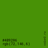 Цвет #489206 в цветовой модели RGB обозначается тремя октетами (72, 146, 6) в десятичном формате и #489206 в шестнадцатиричном (hex) формате, которые являются интенсивностью красного 72 (hex 48), интенсивность зелёного 146 (hex 92) и интенсивность синего 6 (hex 06).