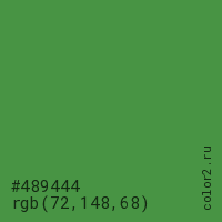 Цвет #489444 в цветовой модели RGB обозначается тремя октетами (72, 148, 68) в десятичном формате и #489444 в шестнадцатиричном (hex) формате, которые являются интенсивностью красного 72 (hex 48), интенсивность зелёного 148 (hex 94) и интенсивность синего 68 (hex 44).