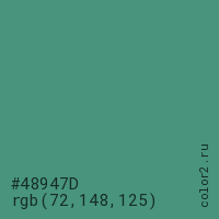 Цвет #48947D в цветовой модели RGB обозначается тремя октетами (72, 148, 125) в десятичном формате и #48947D в шестнадцатиричном (hex) формате, которые являются интенсивностью красного 72 (hex 48), интенсивность зелёного 148 (hex 94) и интенсивность синего 125 (hex 7D).