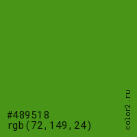 Цвет #489518 в цветовой модели RGB обозначается тремя октетами (72, 149, 24) в десятичном формате и #489518 в шестнадцатиричном (hex) формате, которые являются интенсивностью красного 72 (hex 48), интенсивность зелёного 149 (hex 95) и интенсивность синего 24 (hex 18).