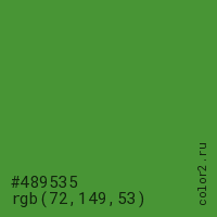 Цвет #489535 в цветовой модели RGB обозначается тремя октетами (72, 149, 53) в десятичном формате и #489535 в шестнадцатиричном (hex) формате, которые являются интенсивностью красного 72 (hex 48), интенсивность зелёного 149 (hex 95) и интенсивность синего 53 (hex 35).