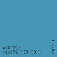 Цвет #4896B5 в цветовой модели RGB обозначается тремя октетами (72, 150, 181) в десятичном формате и #4896B5 в шестнадцатиричном (hex) формате, которые являются интенсивностью красного 72 (hex 48), интенсивность зелёного 150 (hex 96) и интенсивность синего 181 (hex B5).