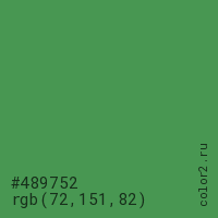 Цвет #489752 в цветовой модели RGB обозначается тремя октетами (72, 151, 82) в десятичном формате и #489752 в шестнадцатиричном (hex) формате, которые являются интенсивностью красного 72 (hex 48), интенсивность зелёного 151 (hex 97) и интенсивность синего 82 (hex 52).