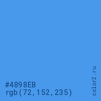 Цвет #4898EB в цветовой модели RGB обозначается тремя октетами (72, 152, 235) в десятичном формате и #4898EB в шестнадцатиричном (hex) формате, которые являются интенсивностью красного 72 (hex 48), интенсивность зелёного 152 (hex 98) и интенсивность синего 235 (hex EB).
