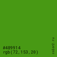 Цвет #489914 в цветовой модели RGB обозначается тремя октетами (72, 153, 20) в десятичном формате и #489914 в шестнадцатиричном (hex) формате, которые являются интенсивностью красного 72 (hex 48), интенсивность зелёного 153 (hex 99) и интенсивность синего 20 (hex 14).