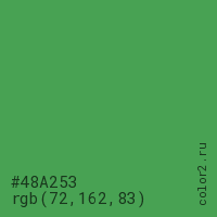 Цвет #48A253 в цветовой модели RGB обозначается тремя октетами (72, 162, 83) в десятичном формате и #48A253 в шестнадцатиричном (hex) формате, которые являются интенсивностью красного 72 (hex 48), интенсивность зелёного 162 (hex A2) и интенсивность синего 83 (hex 53).