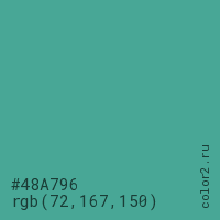 Цвет #48A796 в цветовой модели RGB обозначается тремя октетами (72, 167, 150) в десятичном формате и #48A796 в шестнадцатиричном (hex) формате, которые являются интенсивностью красного 72 (hex 48), интенсивность зелёного 167 (hex A7) и интенсивность синего 150 (hex 96).