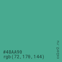 Цвет #48AA90 в цветовой модели RGB обозначается тремя октетами (72, 170, 144) в десятичном формате и #48AA90 в шестнадцатиричном (hex) формате, которые являются интенсивностью красного 72 (hex 48), интенсивность зелёного 170 (hex AA) и интенсивность синего 144 (hex 90).