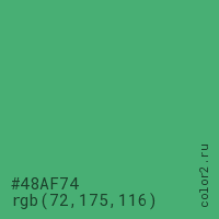Цвет #48AF74 в цветовой модели RGB обозначается тремя октетами (72, 175, 116) в десятичном формате и #48AF74 в шестнадцатиричном (hex) формате, которые являются интенсивностью красного 72 (hex 48), интенсивность зелёного 175 (hex AF) и интенсивность синего 116 (hex 74).