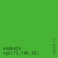 Цвет #48B435 в цветовой модели RGB обозначается тремя октетами (72, 180, 53) в десятичном формате и #48B435 в шестнадцатиричном (hex) формате, которые являются интенсивностью красного 72 (hex 48), интенсивность зелёного 180 (hex B4) и интенсивность синего 53 (hex 35).