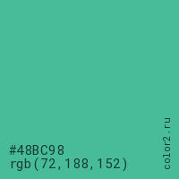 Цвет #48BC98 в цветовой модели RGB обозначается тремя октетами (72, 188, 152) в десятичном формате и #48BC98 в шестнадцатиричном (hex) формате, которые являются интенсивностью красного 72 (hex 48), интенсивность зелёного 188 (hex BC) и интенсивность синего 152 (hex 98).