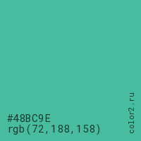 Цвет #48BC9E в цветовой модели RGB обозначается тремя октетами (72, 188, 158) в десятичном формате и #48BC9E в шестнадцатиричном (hex) формате, которые являются интенсивностью красного 72 (hex 48), интенсивность зелёного 188 (hex BC) и интенсивность синего 158 (hex 9E).