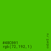 Цвет #48C001 в цветовой модели RGB обозначается тремя октетами (72, 192, 1) в десятичном формате и #48C001 в шестнадцатиричном (hex) формате, которые являются интенсивностью красного 72 (hex 48), интенсивность зелёного 192 (hex C0) и интенсивность синего 1 (hex 01).