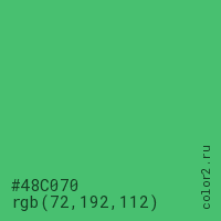 Цвет #48C070 в цветовой модели RGB обозначается тремя октетами (72, 192, 112) в десятичном формате и #48C070 в шестнадцатиричном (hex) формате, которые являются интенсивностью красного 72 (hex 48), интенсивность зелёного 192 (hex C0) и интенсивность синего 112 (hex 70).