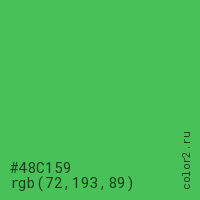 Цвет #48C159 в цветовой модели RGB обозначается тремя октетами (72, 193, 89) в десятичном формате и #48C159 в шестнадцатиричном (hex) формате, которые являются интенсивностью красного 72 (hex 48), интенсивность зелёного 193 (hex C1) и интенсивность синего 89 (hex 59).