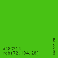 Цвет #48C214 в цветовой модели RGB обозначается тремя октетами (72, 194, 20) в десятичном формате и #48C214 в шестнадцатиричном (hex) формате, которые являются интенсивностью красного 72 (hex 48), интенсивность зелёного 194 (hex C2) и интенсивность синего 20 (hex 14).