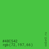 Цвет #48C542 в цветовой модели RGB обозначается тремя октетами (72, 197, 66) в десятичном формате и #48C542 в шестнадцатиричном (hex) формате, которые являются интенсивностью красного 72 (hex 48), интенсивность зелёного 197 (hex C5) и интенсивность синего 66 (hex 42).