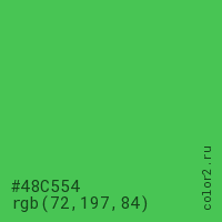 Цвет #48C554 в цветовой модели RGB обозначается тремя октетами (72, 197, 84) в десятичном формате и #48C554 в шестнадцатиричном (hex) формате, которые являются интенсивностью красного 72 (hex 48), интенсивность зелёного 197 (hex C5) и интенсивность синего 84 (hex 54).