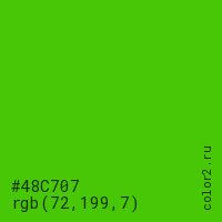 Цвет #48C707 в цветовой модели RGB обозначается тремя октетами (72, 199, 7) в десятичном формате и #48C707 в шестнадцатиричном (hex) формате, которые являются интенсивностью красного 72 (hex 48), интенсивность зелёного 199 (hex C7) и интенсивность синего 7 (hex 07).