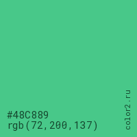 Цвет #48C889 в цветовой модели RGB обозначается тремя октетами (72, 200, 137) в десятичном формате и #48C889 в шестнадцатиричном (hex) формате, которые являются интенсивностью красного 72 (hex 48), интенсивность зелёного 200 (hex C8) и интенсивность синего 137 (hex 89).