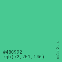 Цвет #48C992 в цветовой модели RGB обозначается тремя октетами (72, 201, 146) в десятичном формате и #48C992 в шестнадцатиричном (hex) формате, которые являются интенсивностью красного 72 (hex 48), интенсивность зелёного 201 (hex C9) и интенсивность синего 146 (hex 92).