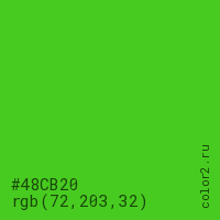 Цвет #48CB20 в цветовой модели RGB обозначается тремя октетами (72, 203, 32) в десятичном формате и #48CB20 в шестнадцатиричном (hex) формате, которые являются интенсивностью красного 72 (hex 48), интенсивность зелёного 203 (hex CB) и интенсивность синего 32 (hex 20).
