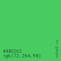 Цвет #48CC62 в цветовой модели RGB обозначается тремя октетами (72, 204, 98) в десятичном формате и #48CC62 в шестнадцатиричном (hex) формате, которые являются интенсивностью красного 72 (hex 48), интенсивность зелёного 204 (hex CC) и интенсивность синего 98 (hex 62).