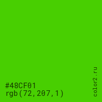 Цвет #48CF01 в цветовой модели RGB обозначается тремя октетами (72, 207, 1) в десятичном формате и #48CF01 в шестнадцатиричном (hex) формате, которые являются интенсивностью красного 72 (hex 48), интенсивность зелёного 207 (hex CF) и интенсивность синего 1 (hex 01).