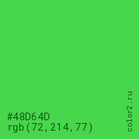Цвет #48D64D в цветовой модели RGB обозначается тремя октетами (72, 214, 77) в десятичном формате и #48D64D в шестнадцатиричном (hex) формате, которые являются интенсивностью красного 72 (hex 48), интенсивность зелёного 214 (hex D6) и интенсивность синего 77 (hex 4D).