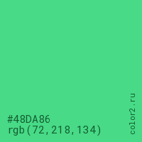 Цвет #48DA86 в цветовой модели RGB обозначается тремя октетами (72, 218, 134) в десятичном формате и #48DA86 в шестнадцатиричном (hex) формате, которые являются интенсивностью красного 72 (hex 48), интенсивность зелёного 218 (hex DA) и интенсивность синего 134 (hex 86).