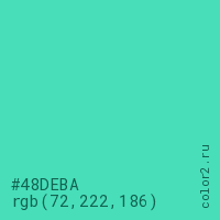Цвет #48DEBA в цветовой модели RGB обозначается тремя октетами (72, 222, 186) в десятичном формате и #48DEBA в шестнадцатиричном (hex) формате, которые являются интенсивностью красного 72 (hex 48), интенсивность зелёного 222 (hex DE) и интенсивность синего 186 (hex BA).