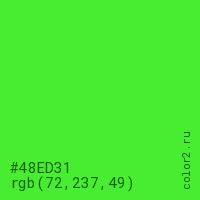 Цвет #48ED31 в цветовой модели RGB обозначается тремя октетами (72, 237, 49) в десятичном формате и #48ED31 в шестнадцатиричном (hex) формате, которые являются интенсивностью красного 72 (hex 48), интенсивность зелёного 237 (hex ED) и интенсивность синего 49 (hex 31).