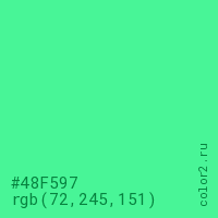 Цвет #48F597 в цветовой модели RGB обозначается тремя октетами (72, 245, 151) в десятичном формате и #48F597 в шестнадцатиричном (hex) формате, которые являются интенсивностью красного 72 (hex 48), интенсивность зелёного 245 (hex F5) и интенсивность синего 151 (hex 97).