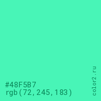 Цвет #48F5B7 в цветовой модели RGB обозначается тремя октетами (72, 245, 183) в десятичном формате и #48F5B7 в шестнадцатиричном (hex) формате, которые являются интенсивностью красного 72 (hex 48), интенсивность зелёного 245 (hex F5) и интенсивность синего 183 (hex B7).