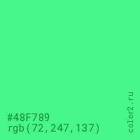 Цвет #48F789 в цветовой модели RGB обозначается тремя октетами (72, 247, 137) в десятичном формате и #48F789 в шестнадцатиричном (hex) формате, которые являются интенсивностью красного 72 (hex 48), интенсивность зелёного 247 (hex F7) и интенсивность синего 137 (hex 89).