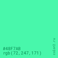 Цвет #48F7AB в цветовой модели RGB обозначается тремя октетами (72, 247, 171) в десятичном формате и #48F7AB в шестнадцатиричном (hex) формате, которые являются интенсивностью красного 72 (hex 48), интенсивность зелёного 247 (hex F7) и интенсивность синего 171 (hex AB).